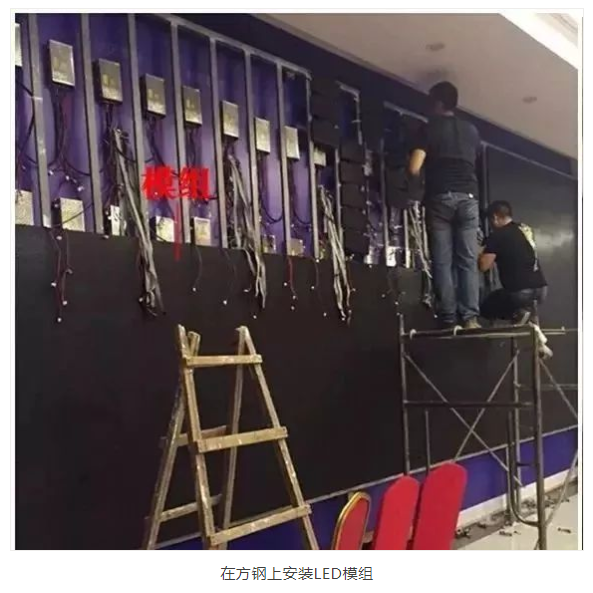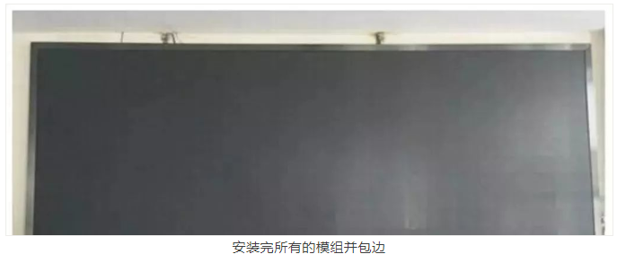 扣好不锈钢边后就能开绐上模组了。模组建议从下往上装,从中间往两边开始安装。这样的安装方式有很多争议,从底部安装主要是为了使水平和垂直都能在正常控制范围内,特别是屏幕的面积大了以后,更加容易失控,特别是小间距的要求超高,有点缝隙没有达到要求,都需要做精细的调整。
