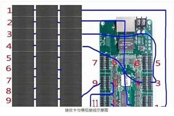 从配电室到LED显示屏配电柜的电缆在安装屏幕之前就必须布置好,电源接好后装控制卡,控制卡这里用的是同步接收卡。整个电源和控制卡的布置,LED显示屏出厂都是有《电源及系统布线图》的,只要严格参照图纸走线就不会出错。一般工程师自己根据电源和卡的数量也可以估算出走线方式。