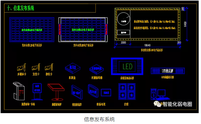 信息发布系统弱电设计图标主要有LED屏,LCD屏,发送卡,接收卡,音箱等组成。