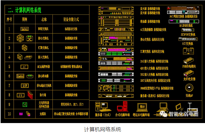 在弱电工程师勘测现场结束后,需要在原先设计院的CAD图纸重新进行深化设计,图纸上会修改设备类型,安装方式,线缆走向及设备图标。下面重点介绍弱电行业常用的智能化弱电设计图标。