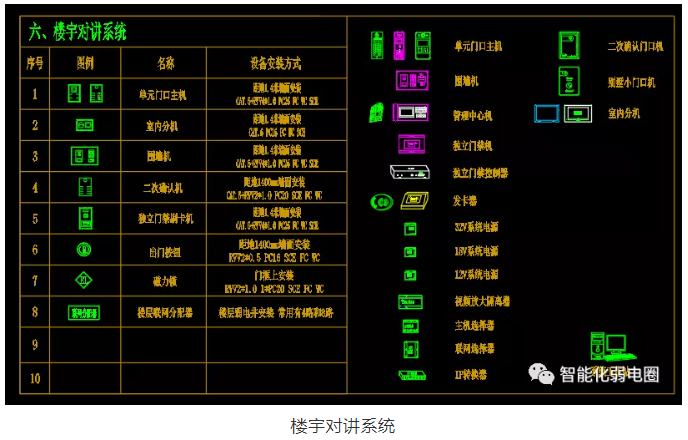 楼宇对讲系统弱电设计图标主要有单元门口主机、室内分机、围墙机、出门按钮、磁力锁,管理中心机,门禁控制器等组成。