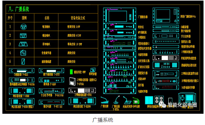 广播系统弱电设计图标主要包括吸顶喇叭,网络广播服务器,节目定时器,功放,音柱等组成。