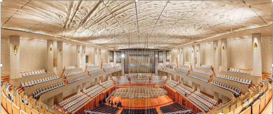 音乐厅的天花板形状不规则的白色浮雕像一片起伏的沙丘。天花板上看似凌乱的沟槽实际上经过了特别的声学设计,使声音能够被扩散反射,更加均匀、柔和。精美的天花板其实是特制的声扩散装饰板。天花板使用纤维石膏成型板制成,材质厚重,能够有效地防止低频吸收,增强厅内的低频混响时间,使低音效果(如管风琴、大管、大提琴等)更加具有震撼力和感染力。为达到声效的完美,在顶棚的下面还悬挂了一面龟背形状的集中式反声板,俗称“龟背反声板”,它的作用是将声音向四面八方散射。
